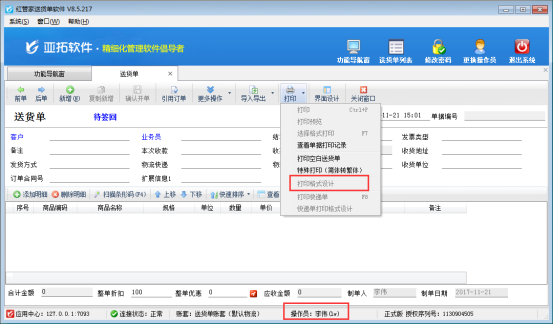 亞拓軟件自主研發(fā)的亞拓管理軟件、紅管家送貨單軟件、紅管家票據(jù)打印軟件、紅管家倉庫管理軟件都支持自定義設(shè)計(jì)打印模板,打印模板設(shè)計(jì)完成后,為了避免操作員修改錯(cuò)打印模板,軟件可以設(shè)置操作員的打印模板設(shè)計(jì)權(quán)限。(系統(tǒng)管理員默認(rèn)具有所有權(quán)限,不允許修改)。 以送貨單軟件為例,示范下如何控制操作員的打印模板設(shè)計(jì)權(quán)限,在功能導(dǎo)航窗,選擇系統(tǒng)管理—》操作員及授權(quán)—》選擇操作員“李偉”,然后在“其他操作權(quán)限”中把打印格式設(shè)計(jì)權(quán)限前的勾選符號(hào)取消,然后點(diǎn)擊“保存權(quán)限設(shè)置”,如下圖1所示:圖1 &