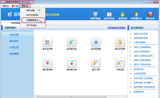 亞拓軟件自主研發(fā)的亞拓管理軟件、紅管家倉庫管理軟件、紅管家送貨單軟件、紅管家出納記賬軟件、紅管家票據(jù)打印軟件等軟件都是不斷升級(jí)更新版本的。亞拓軟件官網(wǎng)會(huì)不定期發(fā)布最新版,新版本會(huì)根據(jù)客戶反饋問題和測試問題改進(jìn)軟件功能并處理程序存在的Bug,從而不斷優(yōu)化和調(diào)整軟件功能、性能。軟件購買后后續(xù)版本免費(fèi)升級(jí),軟件支持聯(lián)網(wǎng)檢查最新版本,用戶檢查到最新版后下載安裝最新版本即可。 本文我們以紅管家送貨單軟件為例,截止到本文發(fā)布日期,紅管家送貨單軟件最新版是V8.5.217版本,我們以V8.5.210版本為例介紹下軟件聯(lián)網(wǎng)檢查最新版的兩