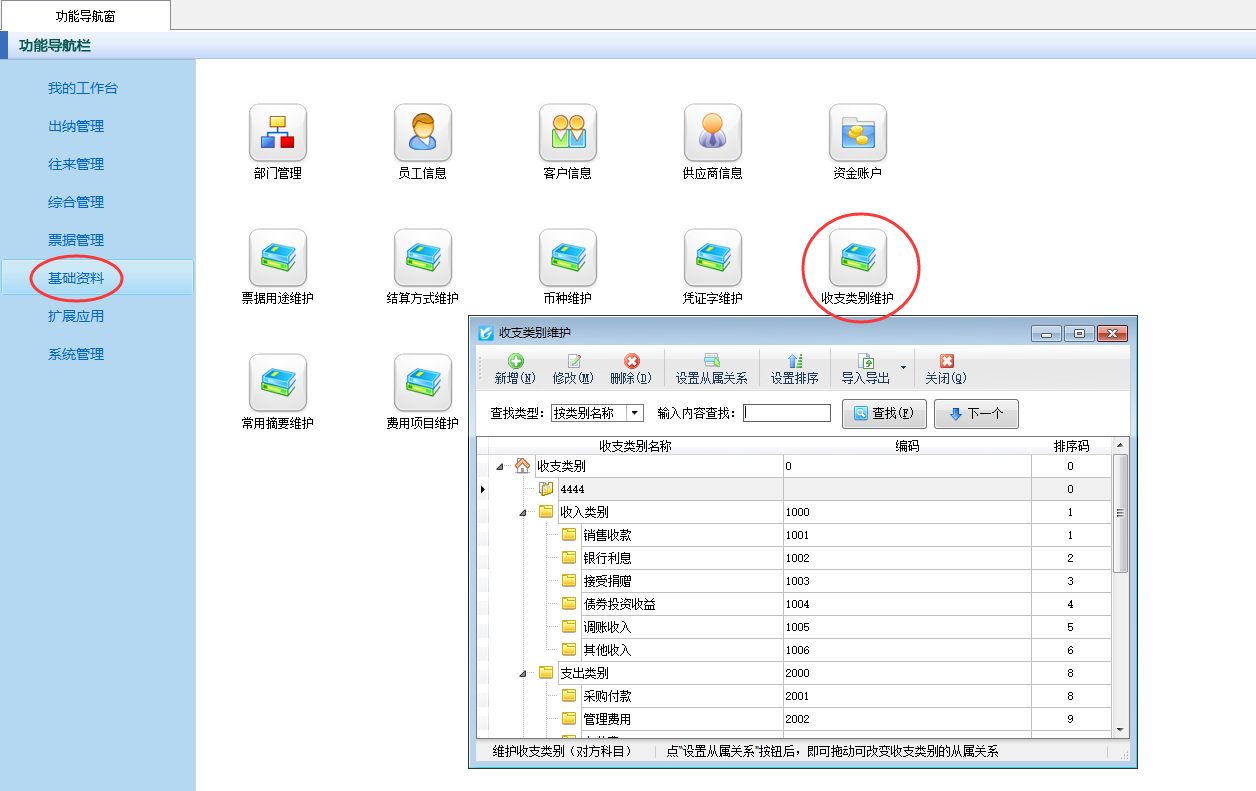 紅管家出納記賬軟件是一款針對(duì)各類企事業(yè)單位財(cái)務(wù)出納記賬開發(fā)的,集現(xiàn)金日記賬記賬與點(diǎn)驗(yàn)、銀行日記賬記賬與核帳、應(yīng)收應(yīng)付往來賬管理、票據(jù)管理(支票管理、承兌匯票管理)、發(fā)票管理、工資管理、個(gè)人借款管理為一體的出納管理記賬軟件。 新增憑證時(shí)在“選擇收支類別”窗口可新增、修改收支類別,但是此界面不支持刪除收支類別(如下圖一所示),部分用戶會(huì)問到如何刪除收支類別,本篇文章我們以出納記賬軟件專業(yè)版為例來詳細(xì)介紹一下出納記賬軟件中如何維護(hù)收支類別?圖一 新增憑證信息 功能導(dǎo)航窗點(diǎn)擊“基礎(chǔ)資料”—》“