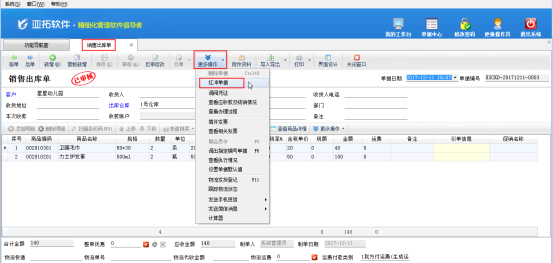 亞拓軟件開發(fā)的新架構(gòu)進(jìn)銷存軟件——亞拓管理軟件具有紅沖單據(jù)的功能,紅沖相當(dāng)于作廢,有時(shí)單據(jù)已審核后又發(fā)現(xiàn)有錯(cuò)誤或者不需要此單據(jù)了,想刪除此單據(jù)時(shí),此時(shí)可以將“已審核”的單據(jù)進(jìn)行紅沖,紅沖后的單據(jù)會(huì)變?yōu)闊o效,相應(yīng)的應(yīng)付款、應(yīng)收款會(huì)刪除,之前對(duì)庫存的影響也會(huì)解除。下面我們以亞拓管理軟件專業(yè)版的銷售出庫單為例,介紹一下紅沖單據(jù)(作廢單據(jù))的操作方法。1、可以在銷售單列表紅沖作廢銷售出庫單 在功能導(dǎo)航窗點(diǎn)擊“銷售管理”—》“銷售單列表”即可打開“銷售單列表”界面,選中需要作廢的單據(jù),然后點(diǎn)擊“更多操作”—》“紅沖單據(jù)(作廢單據(jù))