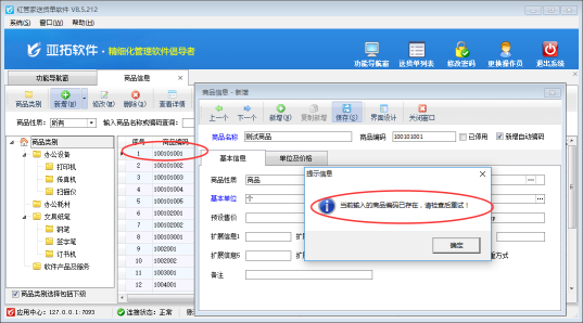 亞拓軟件自主研發的亞拓管理軟件、紅管家送貨單軟件、紅管家倉庫管理軟件等都支持新增商品信息,為了避免增加的商品信息出現重復,軟件支持參數設置商品編碼不可重復。 以紅管家送貨單軟件為例,在系統管理—》系統參數配置—》業務參數內將“數據可否重復參數”中的“商品編碼可重復”參數的勾選取消,然后保存設置。如下圖所示: 設置完成后,打開功能導航窗的“基礎資料”—》“商品信息”,新增一個商品,輸入和之前已增加過的商品一樣的編碼,保存時系統會提示“當前輸入的商品編碼已存在,請檢查后重試!”,如下圖所示