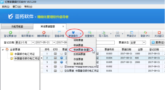 紅管家票據打印軟件是亞拓軟件針對企事業單位票據管理及打印需求而開發的一款票據管理軟件,主要包括支票管理、承兌匯票管理、其他票據管理(銀行進賬單、電匯憑證等)、快遞單管理、萬能票據打印、票據打印模板管理、票據查詢檢索等功能。 其他票據管理可以對其他票據進行從登記—》領用—》填開—》核銷的流程化管理,只有已領用的票據才可以核銷。軟件支持批量核銷票據,為客戶核銷票據節省時間,提高工作效率。本文以紅管家票據打印軟件為例介紹一下如何批量核銷其他票據。 在功能導航窗中點擊“票據管理”—》“其他票據