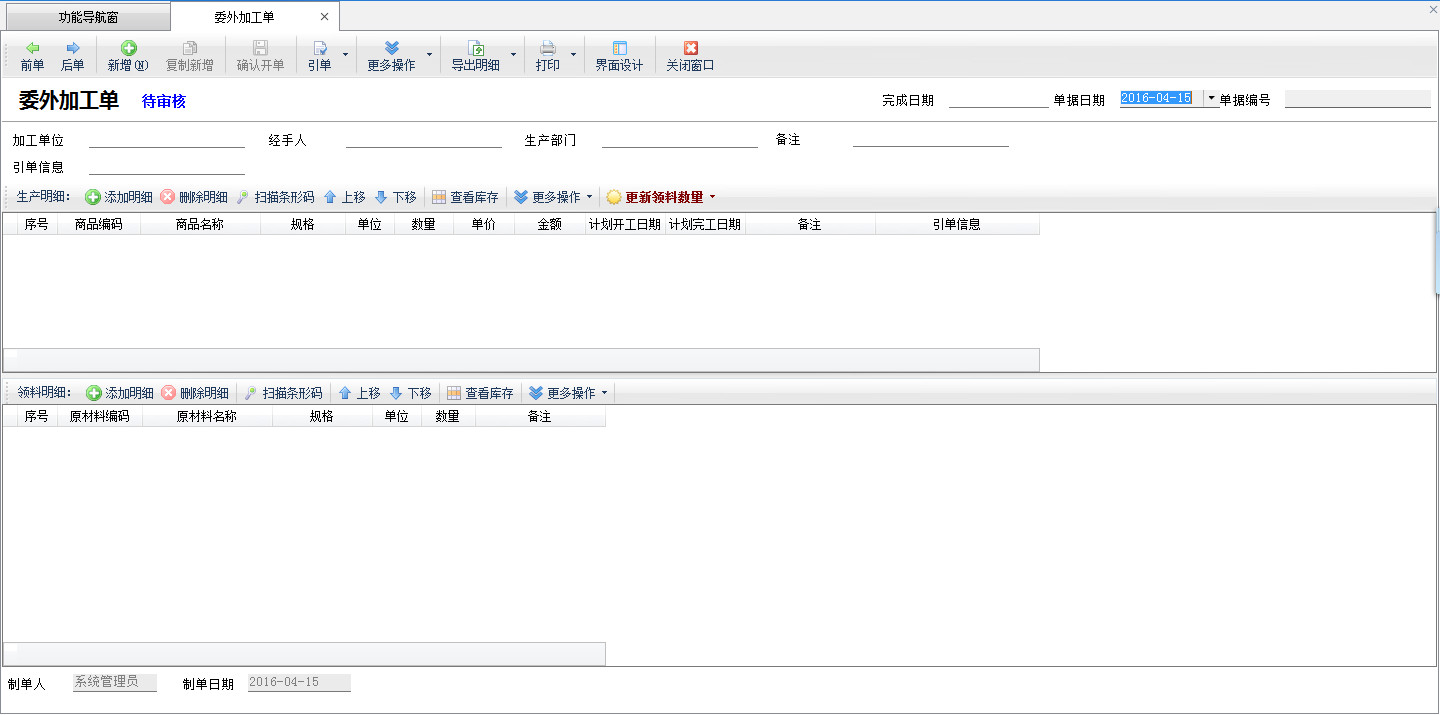 亞拓管理軟件標準版及以上版本可以購買委外加工管理功能模塊來管理生產業務中的委外代加工業務,委外加工單類似于自己生產情況下的生產任務單,用于向外部代加工廠下單加工任務。委外加工單可以引用生產計劃單,也就是說軟件支持生產計劃單一部分自己生產,一部分由外部代加工廠生產的情況。 在功能導航窗,點“生產管理”—》“委外加工”—》“委外加工單”,即可進入委外加工單界面,如下圖所示: 為了方便后續估算和采購原材料,軟件分為上下兩部分,上方為生產產品明細,下方為用料明細,添加一個委外加工產品后,軟件會