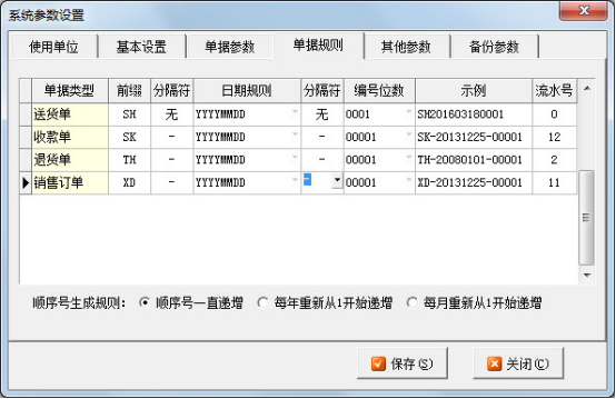 紅管家送貨單軟件中在開單時軟件會自動生成一個單據(jù)編號,因此可以對單據(jù)編號規(guī)則進行設(shè)置,這樣我們對單據(jù)進行查詢時可根據(jù)單據(jù)編號就可以讀取單據(jù)信息,軟件中支持根據(jù)自己的實際業(yè)務(wù)需求來設(shè)置單據(jù)規(guī)則,下面我們演示一下具體的操作步驟。 在主窗口菜單“系統(tǒng)管理”—》“系統(tǒng)參數(shù)設(shè)置”菜單項,點擊“單據(jù)規(guī)則”,如下圖1所示:圖11、單據(jù)編號規(guī)則設(shè)置:可分別對送貨單、收款單、退貨單、銷售訂單進行單據(jù)規(guī)則設(shè)置,我們可以根據(jù)自己的需求進行單據(jù)編號設(shè)置,軟件中內(nèi)置的分隔符、日期規(guī)則以及編號位數(shù)有多種樣式可供我們選擇,前綴你可以自己設(shè)置,示例中可