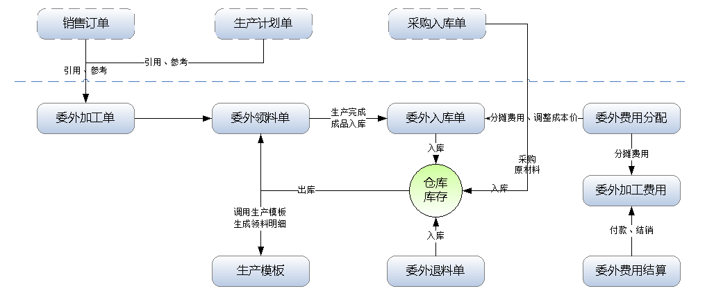 實際的企業(yè)生產(chǎn)業(yè)務(wù)中經(jīng)常會涉及委外代加工業(yè)務(wù),有時候需要委托外部工廠幫我們生產(chǎn)一些配件,有時候需要幫忙生成半成品,然后委外生產(chǎn)的成品或半成品,再進入我們車間進行再加工(如包裝封箱、或二次加工等)。專業(yè)版及以上版本可以購買 “委外加工管理”擴展功能模塊來管理此業(yè)務(wù)。 在功能導(dǎo)航窗,點擊“生產(chǎn)管理”—》“委外加工”,即可進入委外加工管理界面,如下圖所示。 對委外加工需要我們提供原材料(即我們采購的原材料),需代加工廠生產(chǎn)時,我們出庫運送給代工廠(也有可能采購的原材料直接存放在代加工廠倉庫