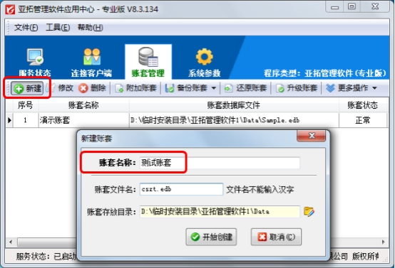賬套即賬套數據庫,這是一個會計業務引申出來的概念,賬套數據庫中存儲業務數據。使用軟件之前建議新增加一個賬套,用于重新錄入和管理數據,亞拓管理軟件(星光版、標準版、專業版)、紅管家倉庫管理軟件(標準版、專業版)、紅管家送貨單軟件、紅管家票據打印軟件等軟件的賬套都是在主機電腦的應用中心程序上集中管理的,下面我們以亞拓管理軟件專業版為例詳細介紹下在使用軟件之前如何新增加一個賬套? 運行亞拓管理軟件應用中心并打開亞拓管理軟件應用中心程序界面,主機電腦上軟件安裝后會在桌面上自動創建“亞拓管理軟件專業版應用中心(