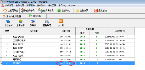 一、期末結(jié)賬功能描述 紅管家財(cái)務(wù)出納記賬系統(tǒng)包括期末結(jié)賬的功能,當(dāng)本期(即本月)的業(yè)務(wù)已審核處理完畢,就可以進(jìn)行期末結(jié)賬處理。結(jié)賬后自動(dòng)進(jìn)入下一個(gè)賬期(月份),12月份結(jié)賬后將進(jìn)入下一個(gè)年度。結(jié)賬后如果發(fā)現(xiàn)單據(jù)錯(cuò)誤或賬簿數(shù)據(jù)有誤,可以進(jìn)行反結(jié)賬處理。 點(diǎn)擊主窗口菜單“業(yè)務(wù)處理”——》“期末結(jié)帳”系統(tǒng)進(jìn)入“期末結(jié)帳”窗口,如圖1所示。圖1 期末結(jié)賬的界面 本期結(jié)帳:在帳戶列表中,選擇一個(gè)帳戶,點(diǎn)擊工具欄中的“本期結(jié)帳”按鈕即可。已結(jié)賬的賬期不允許增加新憑證,也不允許修改原有憑證。如發(fā)現(xiàn)錯(cuò)誤