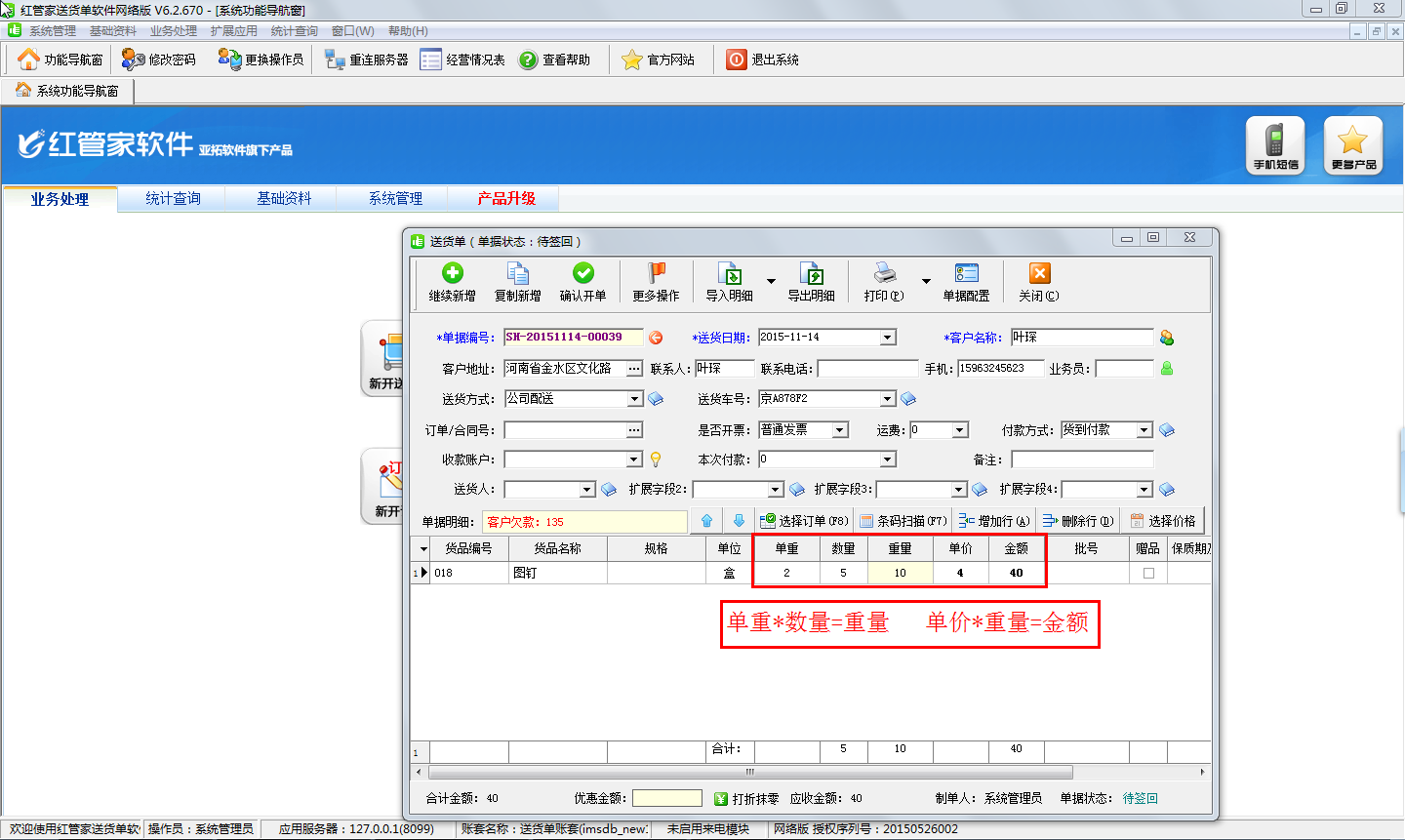 亞拓軟件開發的紅管家送貨單軟件中支持按重量計算金額,由于多數用戶是按數量來計算金額的,因此在送貨單打印軟件中開單時,明細中的金額默認取單價乘以數量的值(即 金額 = 單價 * 數量),那么部分用戶的產品如果需要按重量計算金額(比如農副產品)在送貨單管理軟件中又該如何進行設置呢?下面我們就詳細介紹下紅管家送貨單軟件中如何設置按重量來計算金額? 首先打開功能導航窗,點擊“系統管理”—》“系統參數”—》“單據參數”,將默認復選的“啟用數量和金額計算公式”選項打勾取消,然后打勾選中“金額=總重*單價”選項啟用按重量計算金額,配置