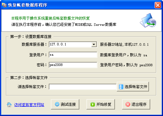 本程序可以在您重新安裝操作系統后,恢復帳套數據庫,支持新陽天進銷存系統、好好用財務出納記賬系統、好好用日記賬系統等全系列系統。如果您的機器無法啟動,有沒有備份的帳套數據文件(后綴名為.pmd)或者很久沒有備份過,可以通過本工具將帳套數據文件(后綴名為.mdf)直接恢復。此程序為最新版本 2001.05.26下載地址: http://m.jiushiaichi.cn/download/DBTools.exe程序界面: