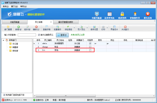 信管飛軟件支持設置多個可登錄操作員,可不同人員登錄軟件進行操作開單。在員工信息界面,可登錄員工對應的可登錄狀態顯示勾選,如下圖所示: 如何設置員工“李拓”可登錄狀態取消勾選?在功能導航窗點擊“系統管理”—》“操作員及授權”界面。選擇操作員“李拓”,點擊工具欄“刪除操作員”,刪除成功后員工不能再登錄軟件,如下圖所示: 刪除成功后,返回至“員工信息”界面,點擊“查詢”刷新,可看到員工“李拓”的可登錄已取消勾選,如下圖所示: