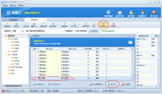 信管飛RMS軟件、信管飛送貨單軟件等需要先維護基礎資料--商品信息及客戶信息,后期實際開單操作可以直接選擇已維護信息,有用戶咨詢需要查看商品的錄入日期,在軟件中如何查看?本文以信管飛送貨單軟件為例進行示范。 在功能導航窗點擊“基礎資料”—》“商品信息”,在“商品信息”界面點擊“界面設計”勾選“錄入日期”數據項,然后點擊“保存”按鈕保存界面配置。 歡迎下載試用可自定義設置界面設計的軟件:信管飛送貨單軟件