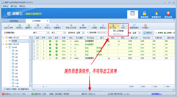 在財務管理日益精細化的今天,一款專業的出納記賬軟件顯得尤為重要。信管飛出納記賬軟件憑借其強大的工資管理功能,成為眾多企業的首選。該軟件不僅支持自定義工資模板,還能快速生成工資單,極大地提升了工作效率。 尤為值得一提的是,信管飛出納記賬軟件在安全性上也下足了功夫。通過設置操作員權限,企業可以確保敏感信息的保密性。例如,禁止操作員導出工資記錄,有效防止信息泄露。 具體操作步驟簡單明了:登錄軟件后,進入“系統管理”的“操作員及授權”界面,選擇對應操作員并取消其工資單管理的“導出”權限,保存設