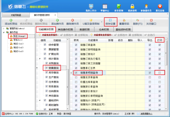 進銷存管理軟件、信管飛倉庫管理軟件、信管飛送貨單軟件、信管飛出納記賬軟件等軟件內都提供的有打印預覽及打印功能,可以打印銷售單、對賬單及各類統計報表。然而,有用戶反映,在銷售單明細查詢界面,他們希望無需操作員手動執行打印操作。針對這一需求,本篇文章以“信管飛RMS軟件”為例介紹下如何解決? 功能導航窗點擊“系統管理”—》“操作員及授權”,進入操作員管理及授權界面,選擇操作員“張亞”,功能模塊權限下,找到“銷售查詢”下的“銷售單明細查詢”,把“打印”權限取消勾選,取消后保存權限,如圖: &n