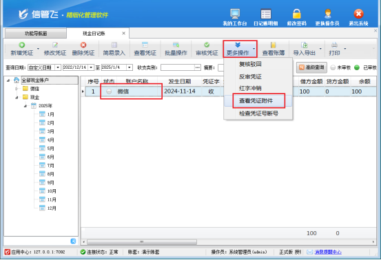 信管飛出納記賬軟件在新增或修改憑證時,允許用戶添加文檔、圖表等豐富的附件資料,支持掃描或直接導入與出納憑證相關的電子文件。這一功能極大地方便了用戶全面、直觀地回溯和查詢日記賬憑證的詳細信息,有效提升了企業對日記賬憑證的管理效率。當用戶需要在日記賬列表界面快速查看某一憑證的附件時,信管飛出納記賬軟件提供了直接在列表中打開附件資料的便捷功能。本文以“信管飛出納記賬軟件”為例介紹一下如何在日記賬列表界面輕松查看憑證附件? 功能導航欄點擊“出納管理”,現金/銀行日記賬,選中需要查看附件的憑證,工具欄點擊更