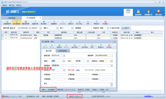 信管飛出納記賬軟件的員工借款管理及還款管理可以對企業員工借款、還款進行流程化登記管理,提高了企業管理效率。 演示視頻觀看鏈接:操作員無法修改其他人員創建的員工借款單,如何解決演示視頻 有用戶操作員賬號登錄軟件修改員工借款單時,提示“當前數據由其他人員創建,您沒有權限修改!”,如下圖所示。 出現以上問題的原因是:當前登錄的操作員賬號沒有可修改其他人員創建的員工借款單權限。 解決方法如下:使用系統管理員賬號登錄軟件,在