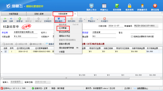 信管飛RMS軟件是集進銷存和應收應付款管理一體的軟件,有客戶咨詢需要反審修改單據的單價時修改不了,如何解決,提示如下圖所示: 已結銷應付款的單據需要反審修改,需變為“未結銷”狀態,快捷操作方式,在采購入庫單界面點擊更多操作下的“查看應付款及結銷情況”,彈出界面點擊“查看結算單”如下圖所示: 點擊“查看結算單”會進入付款結算單界面,關閉應付款及結銷情況界面,在付款結算單界面可以點擊工具欄“更多操作”下的“紅沖單據”,作廢付款結算單。如下圖所示:&nbs