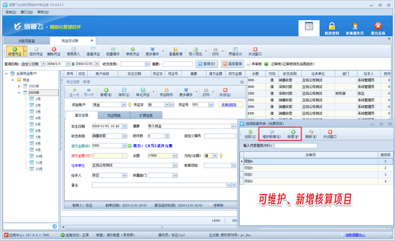 信管飛出納記賬軟件支持在日記賬憑證界面輸入核算項(xiàng)目,也支持按核算項(xiàng)目統(tǒng)計(jì),方便用戶統(tǒng)計(jì)不同項(xiàng)目的日記賬信息。有用戶在登記出納憑證時(shí),只能從已維護(hù)好的核算項(xiàng)目?jī)?nèi)容進(jìn)行選擇,而不能維護(hù)、新增核算項(xiàng)目?jī)?nèi)容,如下圖所示。 演示視頻觀看鏈接:操作員無法維護(hù)出納憑證的核算項(xiàng)目,如何解決演示視頻 出現(xiàn)以上問題的原因是:登錄的操作員賬號(hào)沒有可維護(hù)出納憑證核算項(xiàng)目的權(quán)限。 解決方法如下:使用系統(tǒng)管理員賬號(hào)登錄軟件,在功能導(dǎo)航窗點(diǎn)擊“系統(tǒng)管理”—》“操作員及授權(quán)”打開操