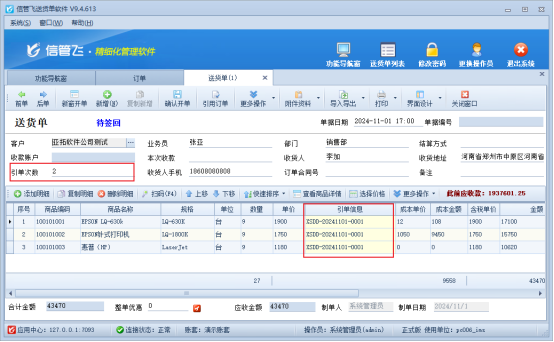 信管飛RMS、信管飛倉(cāng)庫(kù)管理軟件、信管飛送貨單軟件等都支持開銷售出庫(kù)單來管理銷售送貨。部分用戶存在客戶先下訂單然后根據(jù)銷售訂單進(jìn)行發(fā)貨。為了避免重復(fù)發(fā)貨,軟件可設(shè)置銷售出庫(kù)單引單生成,顯示引單次數(shù),造成多次發(fā)貨。 本文以“信管飛送貨單軟件”為例,介紹送貨單引用訂單,如何顯示引單次數(shù)? 在功能導(dǎo)航窗選擇“系統(tǒng)管理”—》“系統(tǒng)參數(shù)配置”,在業(yè)務(wù)參數(shù)的“特殊功能參數(shù)”中勾選啟用參數(shù)“送貨單引用訂單(引單次數(shù))”,參數(shù)值默認(rèn)擴(kuò)展數(shù)值extnum2(可修改其他擴(kuò)展數(shù)值),保存參數(shù)配置,如下圖所示: