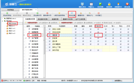 對(duì)于擁有多個(gè)倉(cāng)庫(kù)的企業(yè)而言,實(shí)現(xiàn)不同倉(cāng)庫(kù)間商品的直接調(diào)撥是一項(xiàng)常規(guī)業(yè)務(wù)。信管飛軟件標(biāo)準(zhǔn)版與專業(yè)版及倉(cāng)庫(kù)管理軟件都支持分倉(cāng)庫(kù)管理商品,并且內(nèi)置了倉(cāng)庫(kù)調(diào)撥功能,極大地便利了倉(cāng)庫(kù)間的貨品流轉(zhuǎn)。在實(shí)際應(yīng)用中,部分客戶可能僅需查看調(diào)撥單而無需修改,對(duì)此,軟件提供了靈活的操作員權(quán)限設(shè)置功能。本篇文章以“信管飛RMS軟件”為例介紹下如何操作? 首先系統(tǒng)管理員賬號(hào)登錄軟件,在功能導(dǎo)航窗點(diǎn)擊“系統(tǒng)管理”—》“操作員及授權(quán)”,進(jìn)入“操作員管理及授權(quán)”界面,選擇操作員“張亞”,在功能模塊權(quán)限內(nèi)選擇“倉(cāng)庫(kù)管理”模塊,將調(diào)