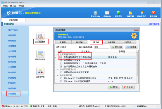 一種商品存在多種規格的情況,軟件可在基礎資料商品信息規格中添加多種規格,開單的時候選擇此商品后規格可以選擇輸入。另外,軟件也支持通過Excel數據導入可以將數據方便快捷的導入到軟件中,省去了使用初期大量的數據的錄入所要消耗的時間及人力物力,并避免人為錄入的誤差,使數據錄入的簡單、準確、高效。本文介紹下如何按商品多規格導入商品信息? 在功能導航窗點擊“系統管理”—》“系統參數配置”,勾選啟用“業務參數”中的“商品規格可以輸入”|“分成多種規格,開單可以選擇”參數。如下圖所示: