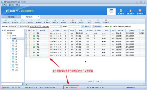 有用戶在使用信管飛出納記賬軟件時,系統管理員賬號登錄軟件可以查看已審核的出納日記賬憑證,但是操作員賬號登錄軟件無法查看已審核的出納日記賬憑證,如下圖所示。 演示視頻觀看鏈接:操作員不可查看已審核的出納日記賬憑證,如何解決演示視頻 出現以上問題的原因是:操作員賬號沒有查看已審核的出納日記賬憑證的權限。 解決方法如下:使用系統管理員賬號登錄軟件,在功能導航窗點擊“系統管理”—》“操作員及授權”打開操作員管理及授權界面,選擇操作員賬號,在“其他操作權限”界