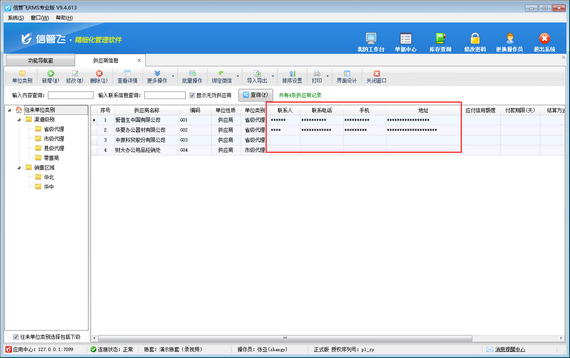 信管飛RMS支持基礎資料數據維護,包括客戶信息、供應商信息、商品信息、員工信息、倉庫信息、資金賬戶等信息,另外,也支持對基礎資料數據項進行權限控制,本篇文章介紹一下如何設置操作員不可查看供應商聯系信息? 演示視頻觀看鏈接:信管飛RMS如何設置操作員不可查看供應商聯系信息演示視頻 首先需要啟用基礎資料數據項權限控制參數,在功能導航窗點擊“系統管理”—》“系統參數配置”—》“業務參數”打開業務參數配置界面,然后在系統安全及權限參數內勾選啟用“啟用基礎資料數據項權限控制”參數,然后點擊“保存