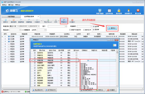 信管飛系列軟件支持單據界面設計,部分用戶在使用軟件過程中,默認開單界面可能與自己需要的界面不一致,軟件支持用戶根據自身業務要求對開單界面進行設置,用戶反饋配置成功后,單據界面不顯示。本文介紹下界面該如何配置? 單據界面配置分為三種情況: 情況一:電腦端界面設計在單據界面,直接點擊界面設計,進入界面設計功能,可以配置電腦端單據主體和單據明細的數據項顯示情況,在顯示列框里勾選顯示,如圖所示: 情況二:移動端