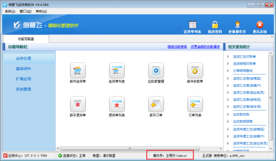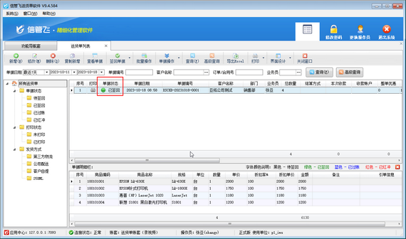 演示視頻觀看鏈接:操作員沒有簽回單據(jù)的權(quán)限,如何解決演示視頻 送貨單一般情況下是一式三聯(lián)(存根聯(lián)、客戶聯(lián)、回單聯(lián)),其中回單聯(lián)的作用是:在購買方收到商品核對完畢,與送貨單上的商品明細相符后,在回單聯(lián)上簽完名,由銷售方拿回,證明貨物已送達,買方確認已簽收。 信管飛送貨單軟件通過狀態(tài)控制實現(xiàn)簡單的流程管理(待簽回—》已簽回—》已結(jié)賬),有用戶在簽回單據(jù)時無法簽回,系統(tǒng)彈出提示信息“您沒有簽回單據(jù)的權(quán)限,請與系統(tǒng)管理員聯(lián)系!”,如下圖所示。 出現(xiàn)此問題的原