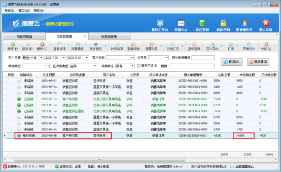 信管飛RMS軟件是集采購(gòu)管理、銷售管理、倉(cāng)庫(kù)管理、往來應(yīng)收應(yīng)付款管理為一體的軟件,軟件支持登記客戶預(yù)付款,客戶下單前可先支付定金,有用戶咨詢上月的預(yù)付款還未結(jié)銷需要退回一部分,軟件中該如何操作?本文以信管飛RMS軟件為例進(jìn)行示范下。 演示視頻觀看鏈接:客戶預(yù)付款需要退回部分,如何操作? 方式一:軟件不需要體現(xiàn)退款記錄,可直接打開銷售訂單修改預(yù)收定金金額為1500元,如下圖所示: 方式二:對(duì)客戶預(yù)付款記錄進(jìn)行結(jié)算操作。