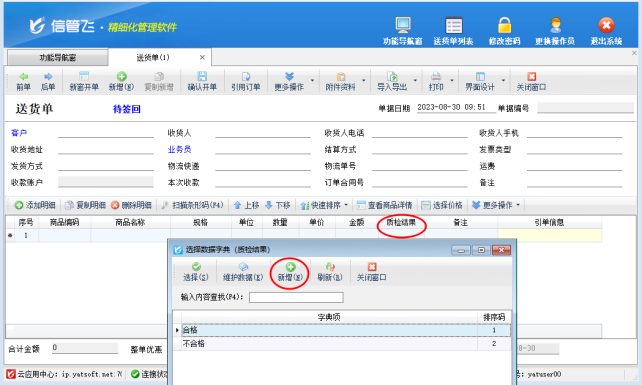 信管飛系列軟件開單界面均支持自定義設(shè)計(jì)顯示數(shù)據(jù)項(xiàng)。軟件除了默認(rèn)顯示的數(shù)據(jù)項(xiàng)外,可以額外添加擴(kuò)展數(shù)據(jù)項(xiàng),擴(kuò)展信息數(shù)據(jù)項(xiàng)支持設(shè)置取值方式,如果擴(kuò)展字段內(nèi)容是固定的,可以設(shè)置為選擇錄入,可大大提高開單效率,本文以“信管飛送貨單軟件”為例,示范下如何設(shè)置擴(kuò)展信息可選擇錄入? 示例:送貨單添加擴(kuò)展信息1(質(zhì)檢結(jié)果),擴(kuò)展信息內(nèi)容固定為:合格或不合格 演示視頻觀看鏈接:如何設(shè)置擴(kuò)展信息可選擇錄入? 功能導(dǎo)航窗選擇“