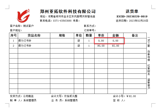 演示視頻觀看鏈接:打印模板如何設置明細欄零值不顯示演示視頻 信管飛RMS軟件、信管飛倉庫管理軟件、信管飛送貨單軟件等支持自定義設計打印模板,送貨單軟件中自帶了十幾種打印模板樣式,部分用戶在設計模板時需要單據單價、金額為0時,模板中零值不顯示,以送貨單軟件為例設置下打印模板明細欄如何不顯示零值。未調整前打印模板顯示如下: 菜單欄點打印—》打印格式設計—》設計格式,進入打印模板設計器界面,選中單價、金額明細欄,鼠標右鍵勾選隱藏零