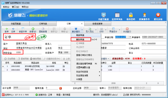 演示視頻觀看鏈接:送貨單軟件如何刪除已完成的訂單演示視頻 信管飛送貨單軟件可以先開訂單,然后實際開送貨單引單進行發貨,有用戶使用中需要刪除已完成狀態的訂單,如何進行刪除操作?本文示范下。 已完成狀態的訂單分兩種:1、無定金;2、有定金。 無定金的訂單,已審核已完成狀態的訂單可直接打開,在更多操作下點擊“紅沖單據”,先紅沖作廢,然后再點擊“刪除單據”可以直接刪除成功,如下圖所示: &