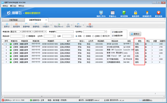 演示視頻觀看鏈接:銷售單界面自定義數據項如何在銷售明細查詢界面配置顯示演示視頻 信管飛系列軟件提供靈活的界面自定義功能,用戶可根據自身業務要求對軟件界面進行設置,軟件支持多個擴展信息及擴展數值,可自定義為需要的數據項,如“顏色”、“長”、“寬”、“面積”等信息。本篇文章介紹一下銷售單界面自定義的數據項如何在銷售明細查詢界面配置顯示? 如下圖所示,銷售出庫單界面配置有“顏色”數據項,在銷售明細查詢界面如何配置顯示? 工具欄點擊“界面設計”—》“單據明細