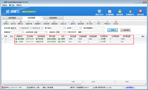 演示視頻觀看鏈接:客戶預付款部分沖銷銷售應收款,如何開收款結算單演示視頻 客戶預付款是客戶提前預付給我們的金額,可以用來沖銷銷售產生的應收款,本文以信管飛出納記賬軟件為例演示一下客戶預付款部分沖銷銷售應收款,如何開收款結算單? 在功能導航窗點擊“往來管理”—》“應收款管理”打開應收款管理界面,如下圖所示,在應收款管理內對同一個客戶分別新增一個銷售應收款記錄,一個客戶預付款記錄,結銷狀態為“未結銷”狀態,已結銷金額為0 在應收款管理界面工具欄點擊“收款結算”按鈕,