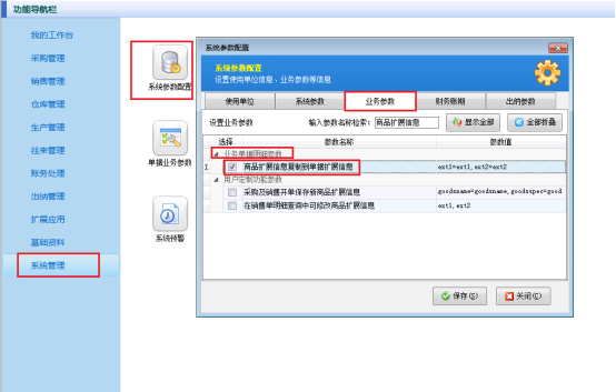 演示視頻觀看鏈接:如何設置商品擴展信息復制到單據擴展信息演示視頻 信管飛RMS軟件、信管飛倉庫管理軟件、信管飛送貨單軟件都支持設置商品的擴展信息提取到單據的擴展信息,啟用此參數后,在開單據時系統會自動調取商品信息中擴展信息的數據,省去了每次開單錄入單據擴展信息的時間,提高了開單效率。下面我們以信管飛RMS軟件為例介紹一下具體的操作步驟。 在功能導航窗點“系統管理”—》“系統參數配置”進入“系統參數配置”界面,業務參數下找到“業務單據明細參數”,勾選“