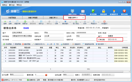 此文章相關演示視頻鏈接:銷售單引用訂單顯示訂單日期演示視頻 信管飛RMS軟件支持先開訂單,然后采購入庫單和銷售出庫單可以引用訂單的內容。有時候需要引用訂單的日期內容,可以銷售單等單據引用訂單的時候銷售單界面顯示引單日期內容。 以銷售單為例,如何引用訂單顯示訂單日期?第一步:啟用參數“銷售單提取訂單日期到附記”。 第二步:先開一個訂單,訂單的日期內容為“2023年2月1日”,保存并審核訂單,訂單內容如下圖