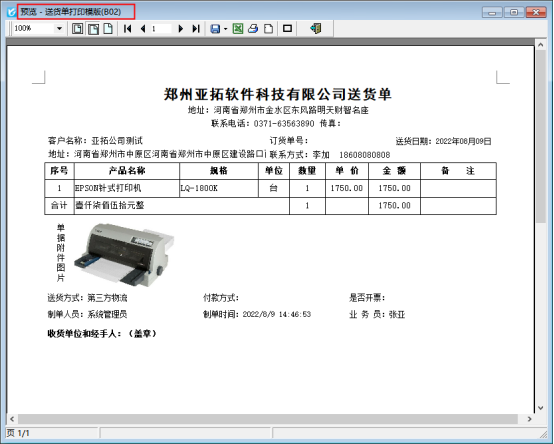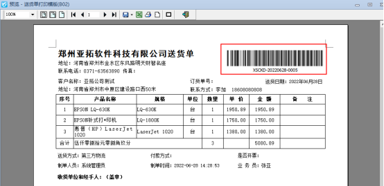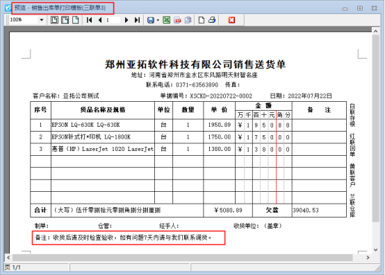 信管飛系列軟件都支持自定義設計打印模板,打印模板如果前期設計的時候沒有添加備注內容(例如:注意事項),后期需要再添加該如何操作?本文以“信管飛送貨單軟件”為例進行示范下。 新開送貨單確認保存,默認打印模板預覽界面如下圖: 需要添加備注內容,在送貨單開單界面點擊“打印”下的“打印格式設計”,選擇模板點擊“設計格式”,進入模板設計器界面,模板設計界面選擇左邊工具欄“插入文本框”,然后放置到頁尾處,文本框寬度可根據輸入的內容進行調整,如下圖所示: