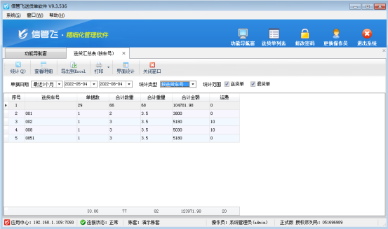 信管飛送貨單軟件為集訂單管理、送貨管理、收款結算等功能并支持送貨明細對賬及業務綜合對賬的送貨單打印軟件。軟件根據錄入的每張訂單及送貨單等數據,可以自動生成統計報表,完成企業銷售統計查詢和與客戶送貨明細對賬的目的,如下圖所示。 送貨單匯總表(按車號)可以根據單據日期、統計類型、統計范圍等查詢條件,統計銷售由不同送貨車號或者送貨司機的單據數、合計數量、合計金額、運費等情況。 首先在開單界面點擊“界面設計”單據主體配置出發貨方式、物流快遞、物流單