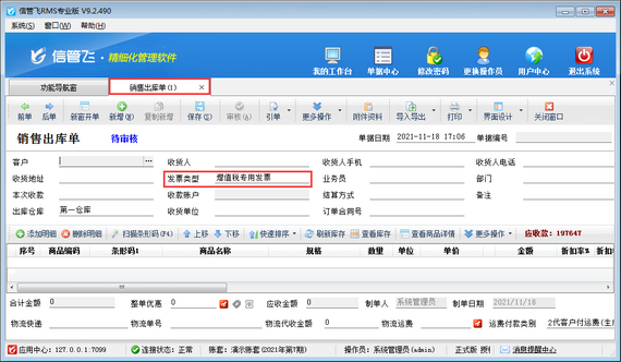 信管飛RMS軟件支持開銷售單選擇發票類型,可以根據實際需要選擇不同的開發票方式。在企業的經營管理過程中,為了快速開單,提高效率,有時需要對單據設置默認值。本篇文章中以信管飛RMS軟件專業版為例詳細介紹下如何設置單據默認發票類型。在功能導航窗點“銷售管理”—》“銷售出庫單”,進入銷售出庫單界面,點擊“更多操作”按鈕,找到“設置單據默認值”,如下圖所示: 點擊“設置單據默認值”,系統彈出“設置單據默認值”窗口。在“設置單據默認值”窗口,可勾選“啟用單據默認值”,選擇需要設置的默認發票類型后點擊“保存”按鈕進行保存。如下圖所示