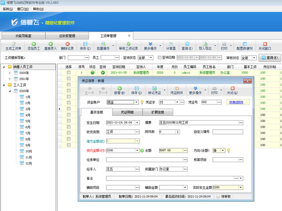 信管飛出納記賬軟件專業版包括工資管理功能,支持自定義工資模板,可根據設置的工資模板快速生成工資單,支持從上月工資單復制工資項目數據,每月工資發放后,可將工資記錄轉記為日記賬憑證,本文介紹一下出納記賬軟件中工資單如何轉記憑證? 在功能導航窗點擊“綜合管理”—》“工資單管理”,打開工資單管理界面,在工資記錄列表中選擇需要轉記日記賬的工資記錄,然后點擊“更多操作”—》“轉記憑證(發現金)/轉記憑證(銀行代發)”,系統彈出提示信息“您是否需要將當前工資記錄轉記為日記賬憑證?”,如下圖所示。 點