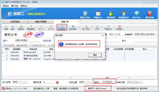 信管飛系列軟件支持新增操作員和設置操作員權限,軟件可登錄多個操作員,為避免操作員之間開的訂單被修改,軟件支持控制操作員不能修改其他人開的訂單,本文以“信管飛倉庫管理軟件銷售訂單”為例,示范如何控制操作員不能修改其他人開的訂單。 在功能導航窗點擊“系統管理”—》“操作員及授權”,打開操作員及授權界面,選擇操作員組的操作員“張亞”,在右側功能權限選擇“數據權限”,把銷售訂單對應的權限“可修改有查看權限的數據”取消勾選,然后保存配置,如下圖所示: 權限設置