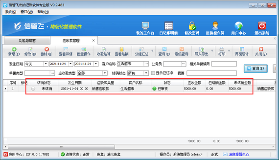 應收、應付賬款管理是現代企業資金管理的重要組成部分,其管理效果的好壞直接影響到企業經營的成敗,出納記賬軟件中含有應收應付往來賬款管理功能,支持對應收款、應付款、預收款、預付款、退貨款等進行管理。如果應收款已結銷后發現收款結銷錯誤,需要刪除結銷記錄,如何刪除?本文演示一下詳細操作步驟。 如下圖所示,客戶“生活超市”應收款5000元已結銷完畢,結銷后發現結銷錯誤,需要刪除,將應收款結銷狀態恢復到“未結銷”狀態。 在應收款管理界面,選擇已結銷的應收款記錄,然后點擊工具欄“查看結銷”按鈕,可以