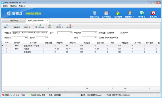 信管飛送貨單軟件為集訂單管理、送貨管理、收款結算等功能并支持送貨明細對賬及業務綜合對賬的送貨單打印軟件。軟件根據錄入的每張訂單及送貨單等數據,可以自動生成統計報表,完成企業銷售統計查詢和與客戶送貨明細對賬的目的,如下圖所示。 其中,送貨匯總表(按客戶)可根據單據日期、客戶名稱、商品名稱等查詢條件,統計銷售給每個客戶的商品匯總數量、銷售均價、銷售金額、成本金額、稅額以及優惠情況。 在功能導航窗點“業務處理”,軟件最右側相關查詢統計中點擊“送貨匯總表(按客戶)”,即可進入“送貨匯總表(按客