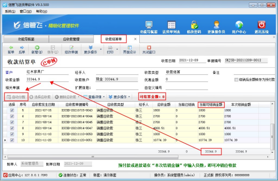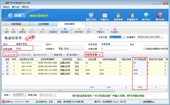信管飛系列下的送貨單軟件、RMS進銷存軟件等都支持開銷售單和管理銷售單生成的對應應收款,如存在客戶付款小于此客戶的應收賬款時,軟件中該如何對此應收款進行結銷?本文以“信管飛RMS軟件”為例,示范下如何結算。 示例客戶:藍貓文具店,應收金額9001,客戶付款5000,在功能導航窗點擊“往來管理”—》“應收款管理”,應收款管理界面,選擇此客戶名稱的應收款記錄,點擊“收款結算”,會彈出收款結算單界面。如下圖所示: 在收款結算單界面,默認是獲取此客戶所有未結