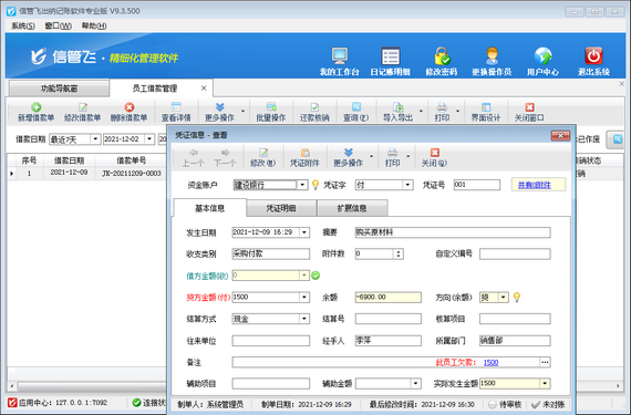 信管飛出納記賬軟件專業版的員工借款管理及還款管理可以對企業員工借款、還款進行流程化登記管理,提高了企業管理效率。員工借款后,借款單支持轉記憑證,本篇文章介紹一下如何查看員工借款相關日記賬憑證? 在功能導航窗點擊“綜合管理”—》“員工借款管理”即可進入“員工借款管理”界面,如下圖所示: 在員工借款管理界面可以查看、新增、修改、刪除借款單,借款單如轉記憑證,在工具欄點擊“更多操作”—》“查看日記賬憑證”即可查看此借款單相關日記賬憑證,如下圖所示。 相關文