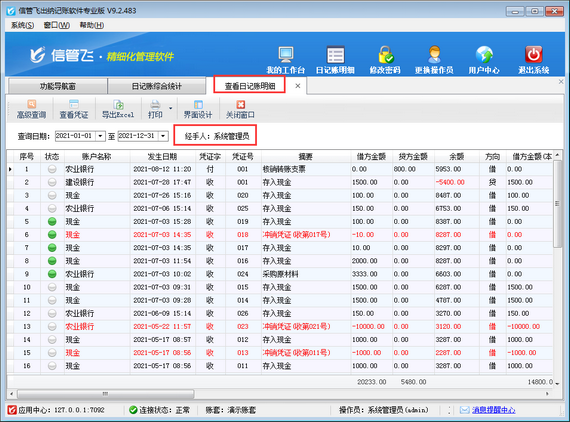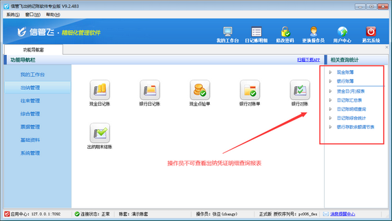 信管飛出納記賬軟件在新增出納憑證時支持錄入憑證明細,方便用戶錄入每個憑證的明細內容(系統默認沒有啟用憑證明細功能,啟用方法請參考:出納憑證如何啟用憑證明細功能?),軟件支持對憑證明細進行查詢統計,如下圖所示。本篇文章介紹一下如何設置操作員不可查詢出納憑證明細內容? 在功能導航窗點擊“系統管理”—》“操作員及授權”,進入“操作員管理及授權”界面,選擇操作員“張亞”,在其右側的功能模塊權限內選擇“出納查詢”模塊,將出納憑證明細查詢的“使用”權限勾選取消,然后保存設置,如下圖所示: 操作員權