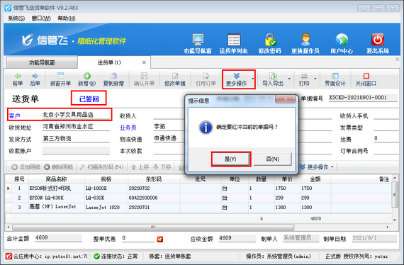 信管飛送貨單軟件是一款針對中小型企業開發的集送貨管理、應收款管理等為一體的送貨單打印軟件。使用軟件時如果送貨單確認開單后,發現客戶名稱有誤,系統不支持直接修改,那么該如何處理呢? 送貨單支持復制新增功能,可以選擇已確認開單的送貨單進行復制新增生成一個一模一樣的新單據。如下圖所示: 復制新增之后,可以對新單據修改客戶名稱。如下圖所示: 新單據開單后,需要對原單據進行刪除。點工具欄中的“更多操作”—》“刪除單據”和“紅沖單據”,可以對單據進行紅沖及刪除。