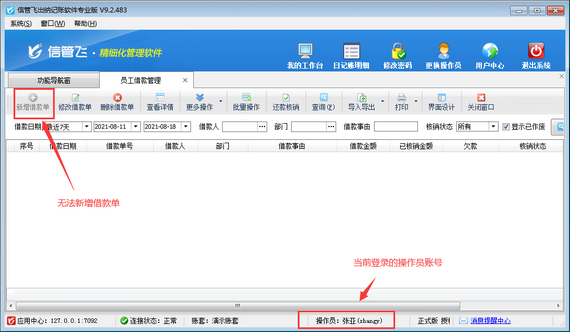 信管飛出納記賬軟件專業(yè)版的員工借款管理及還款管理可以對企業(yè)員工借款、還款進行流程化登記管理,提高了企業(yè)管理效率。本篇文章介紹一下出納記賬軟件如何設置操作員不可登記員工借款? 演示視頻觀看鏈接:出納記賬軟件如何設置操作員不可登記員工借款演示視頻 登錄軟件,在功能導航窗點擊“系統(tǒng)管理”—》“操作員及授權”,進入“操作員管理及授權”界面,選擇操作員“張亞”,在其右側(cè)的功能模塊權限內(nèi)選擇“綜合管理”模塊,將員工借款管理的“新增”權限勾選取消,然后保存設置,如下圖所示。 &