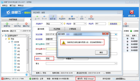 信管飛RMS軟件標準版和專業版、信管飛出納記賬軟件標準版和專業版都包括出納管理模塊,都可以錄入現金日記賬與銀行日記賬憑證。軟件默認操作員可以修改其他人員所開的出納憑證,如果您不想讓操作員修改其他人員所開的出納憑證,可以在軟件中進行設置。下面我們以信管飛RMS軟件專業版為例介紹一下在軟件中如何設置“操作員不可修改其他人員所開的出納憑證”。 系統管理員登錄軟件,在功能導航窗點擊“系統管理”—》“操作員及授權”,進入“操作員管理及授權”界面,如下圖所示,選擇一個操作員,以操作員“張亞”為例,點擊“其他操
