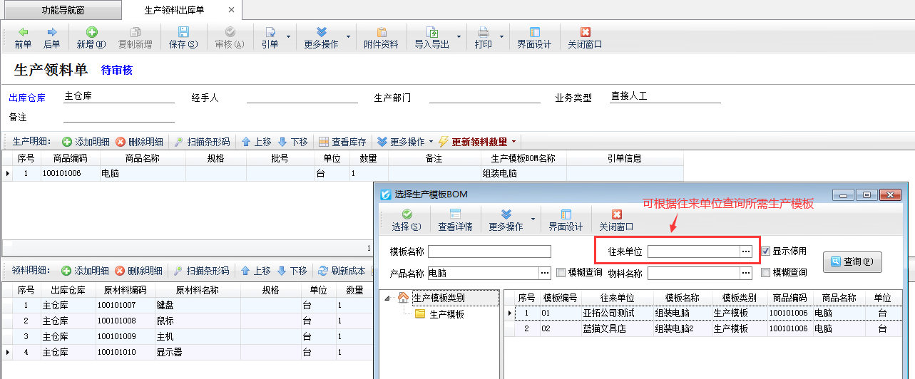 生產模板,即BOM清單(物料清單),可配置每生產一個標準單位的產品需要的原材料種類和數量。如給不同的客戶生產同一個商品時采用的原材料配方不同,軟件也支持設置按客戶管理生產模板,本文介紹一下如何設置按客戶管理生產模板? 在功能導航窗點擊“系統管理”—》“系統參數配置”—》“業務參數”打開業務參數配置界面,然后在生產管理相關參數中打鉤啟用“按客戶管理生產模板”參數,然后點擊“保存”按鈕保存參數配置,如下圖所示。 參數配置完成之后,打開生產管理模塊,重新新增生產模板BOM表時,即可選擇往來單